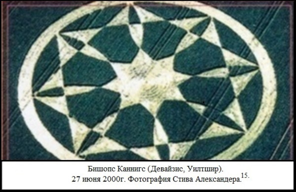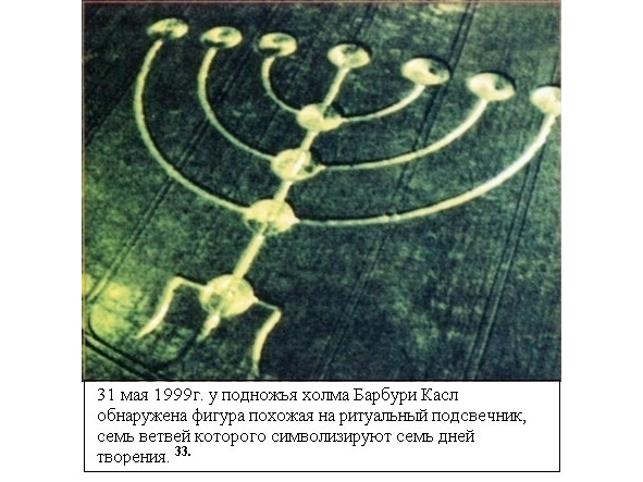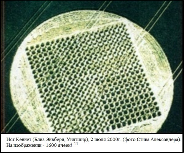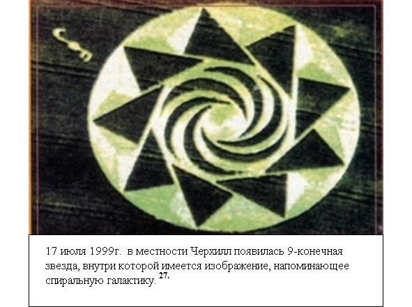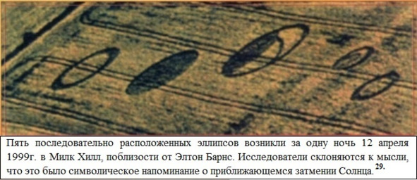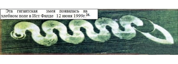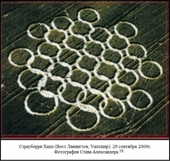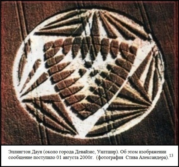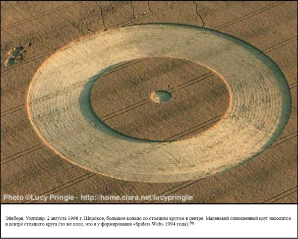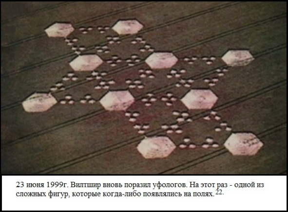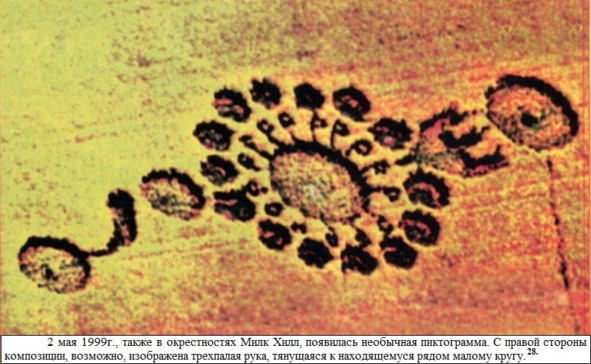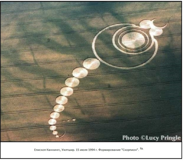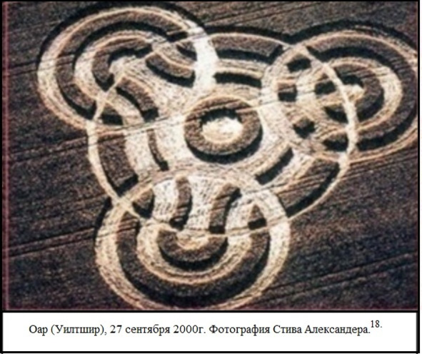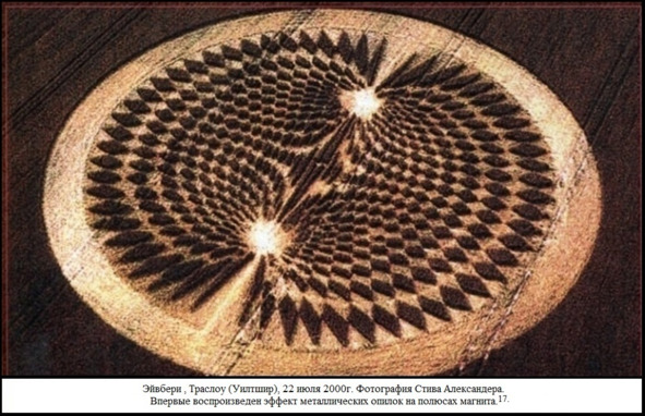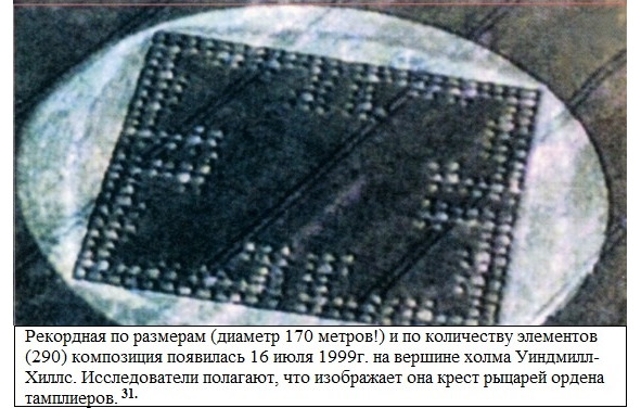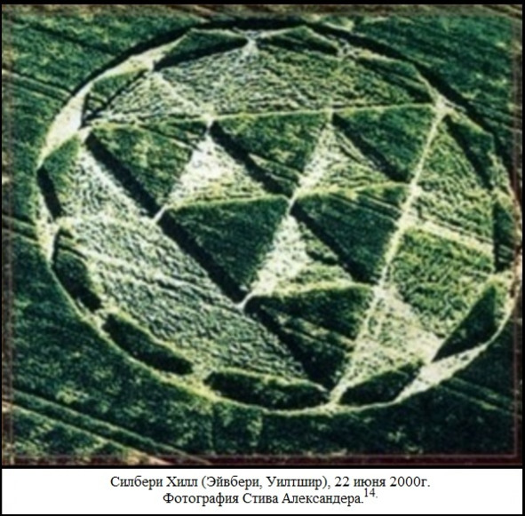 «круг» появляется за счет спирального движения энергии, идущего вслед за летящими объектам… Анализируя верхние данные самой видеопленки, т.е. знаки, которые на пленке видны, можно сделать выводы о том, что… данная пленка была выполнена без применения компьютера – Я полагаю, что нет такого аниматора, который бы смог создать такую пленку… Я не нахожу никаких следов фальсификации данных кадров». Другие независимые эксперты пришли к аналогичному выводу: на пленке зафиксировано реальное событие. Но вот проходит несколько лет и появляется сообщение, что данная видеозапись – фальшивка, к изготовлению которой причастен некий Джон Вейб – один из партнеров студии видеомонтажа и анимации «First Cut Studios» (Бристоль, Великобритания). Под давлением доказательств (а может, некоего давления?) Джон Вейб якобы признал, что видеозапись была подготовлена на студии. О том, как обстояло дело в действительности, общественность может строить только предположения…». Самым впечатляющим в феномене «кругов на полях» является то, что они бывают внушительных размеров. Так журнал «НЛО» опубликовал информацию об обнаружении кругов диаметром 50 м. и 100 м.! Вот эта статья журнала «НЛО» (№36 (507) от 03.09.2007г.): «Но, как прежде, сюрпризами чаще всего балует графство Уилтшир. Там еще 15 апреля 2007 года возле Оливерс-Касл на поле рапса нашли с воздуха – круг, пересеченный дугами. Диаметр круга – ровно 333 фута, то есть чуть больше сотни метров, ширина внешнего круга – 10 метров, ширина дуг примерно по 1,5 метра. Всего их семь. Высота стоящих стеблей – 1,2 метра. Примятые стебли не сломаны и продолжают расти в горизонтальном положении. Из-за того что пиктограмма возникла давно, легко можно было заметить отличия в цветках рапса – внутри круга растения были в полном цвету, тогда как на прилежащей территории уже почти все желтые цветочки осыпались или привяли, так что фон выглядел грязно-зеленым. Цереологи и раньше замечали, что если круг аутентичный (подлинный), а не рукотворный, то растения в его пределах цветут дольше – может быть, потому, что примятым стеблям приходится бороться за выживание. В Эбботс-Даун, тоже в Уилтшире, 5 июня 2007 года нашли удивительную пиктограмму, напоминающую объемное изображение глобуса с четырьмя параллелями и меридианами. В Милк-Хилл была обнаружена красивая, но странная 50-метровая пирамидальная формация, вписанная в окружность (с добавлением четырех малых кругов), как бы указывающая на знаменитую меловую Белую лошадь, что красуется на склоне холма. Однако одна из самых эффектных и загадочных пиктограмм появилась на ячменном поле в Истон-Ройял 12 июня 2007 года. По ее поводу, каких только предположений ни высказывалось! Кто-то считает, что она символизирует начало генезиса, или это схема ядерной реакции, или украшенный перьями головней убор индейца, или подсвечник, или некий циферблат. А кое-кто считает, что это древний 12-месячный мегалитический календарь».