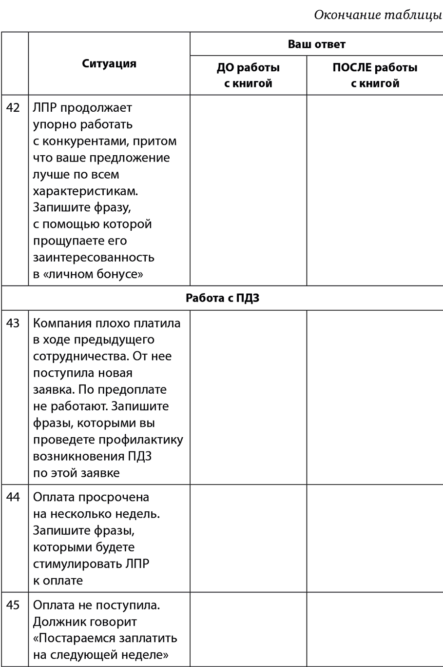 «Навыки продаж и переговоров: до и после работы с книгой»Хотите оценить свой уровень как продавца и увидеть «зону роста»? Замечательно! Ниже приведен тест, включающий описание 45 классических ситуаций, с которыми сталкивается в своей работе практически каждый продавец в сфере B2B. Настоятельно рекомендую перед началом работы с книгой пройти его, записав дословно фразу, которую вы используете в той или иной ситуации, в столбец «До работы с книгой».