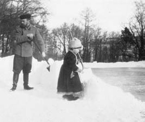 Николай II и цесаревич Алексей убирают снег