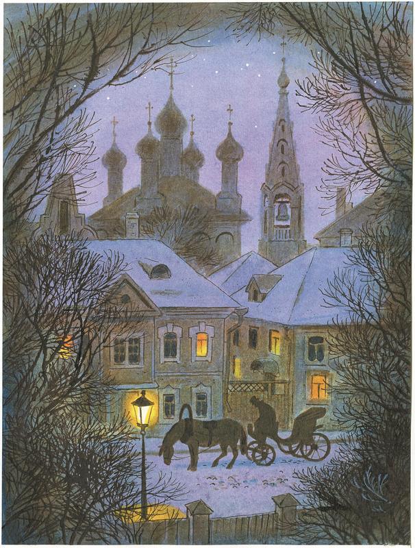 Через дверь, открытую в мутную предутренней мглой комнату, видно, как, под тихие, осторожные шорохи, движется неясная фигура. Она то зыбко выделяется густым серым пятном, то снова расплывается и совсем сливается с мутной мглой. Шорохи стихают, скрипнула половица и ещё одна – подальше. Всё стихло. Это няня ушла в церковь, к утрене.