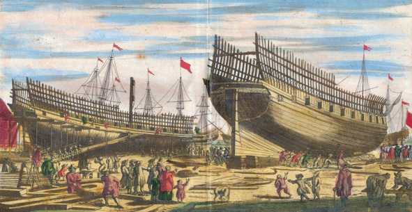 Кораблестроительная верфь. Мастерская гравера П. Пикарта. Иллюстрация к книге Карла Алларда «Новое галанское корабельное строение, глашающее совершение чинения корабля». 1709 г.