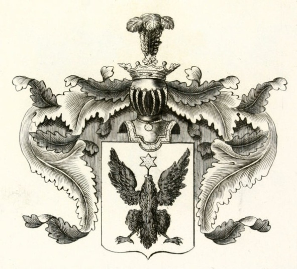 В «Общем гербовнике» дается следующее его описание: «В щите, имеющем серебряное поле, изображен орел без головы красного цвета с распростертыми крылами, у которого вместо головы означена золотая звезда шестиугольная. Щит увенчан обыкновенным дворянским шлемом с дворянскою на ней короною и тремя страусовыми перьями. Намет на щите серебряный, подложенный красным».13 Основной символ герба очень древний и восходит к XIV—XV вв., но при каких обстоятельствах Иерусалимская звезда – христианский символ – заменила голову орла, неизвестно. По одной из легенд герб имеет венгерское происхождение, и появился при Иштване Батории: якобы он был дан некоему роду, представителю которого отрубили голову при штурме какой-то крепости. Однако современные специалисты считают, что герб имеет польско-литовское, точнее белорусское происхождение, поскольку Белоруссия в XVII в. входила в состав Речи Посполитой.