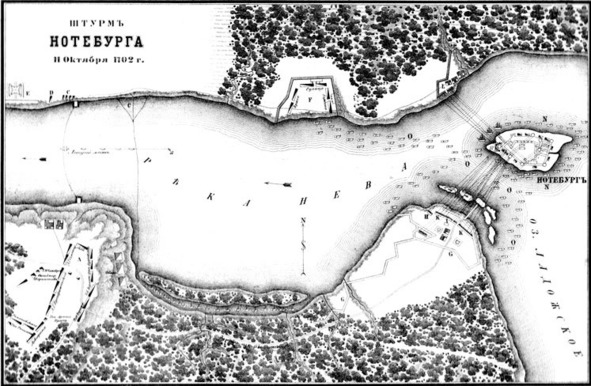 Карта-схема штурма Нотебурга. Рисунок из книги «Карты, планы и снимки к 4-му тому „Истории царствования Петра Великого“ Николая Устрялова». 1863 г.