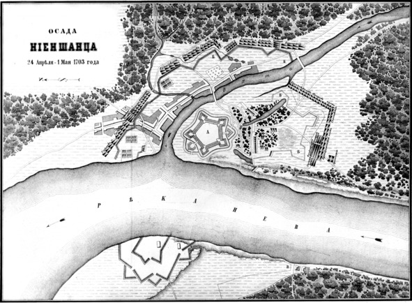 Карта-схема осады Ниеншанца. Рисунок из книги «Карты, планы и снимки к 4-му тому „Истории царствования Петра Великого“ Николая Устрялова». 1863 г.