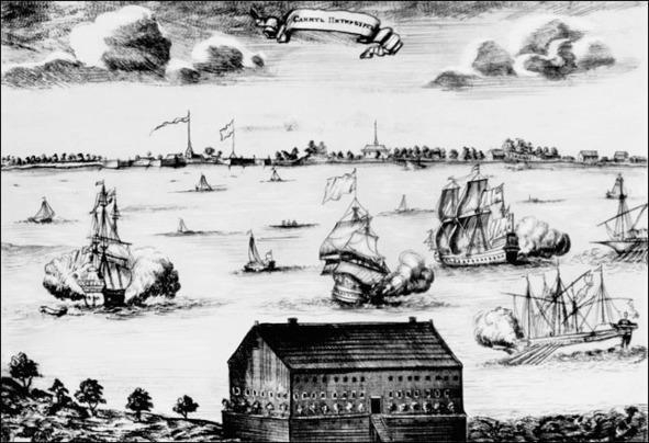 Вид Санкт-Петербурга, фрегатов и галер Балтийского флота в октябре 1704 г. («Первый вид Петербурга»). Гравюра П. Пикарта. 1704 г.