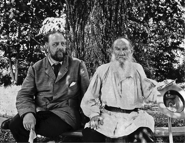Л. Н. Толстой и В. Г. Чертков во время прогулки. 1910.