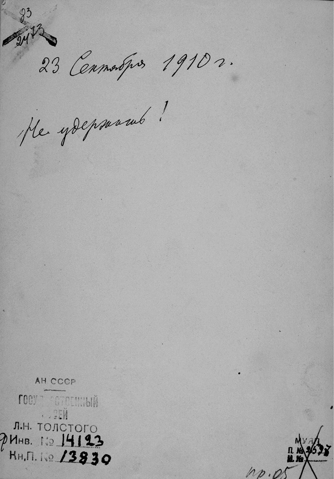 Потерял маленький дневник. Пишу здесь. Начало дня было спокойно. Но за завтраком начался разговор о «Детской мудрости», что Чертков, коллекционер, собрал. Куда он денет рукописи после моей смерти? Я немного горячо попросил оставить меня в покое. Казалось, ничего. Но после обеда начались упреки, что я кричал на нее, что мне бы надо пожалеть ее. Я молчал. Она ушла к себе, и теперь 11-й час, она не выходит, и мне тяжело. От Черткова письмо с упреками и обличениями. Они разрывают меня на части. Иногда думается: уйти ото всех. Оказывается, она спала и вышла спокойная. Я лег после 12-ти.