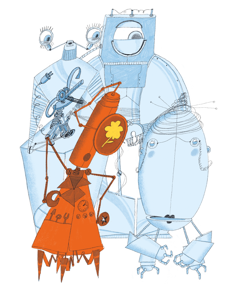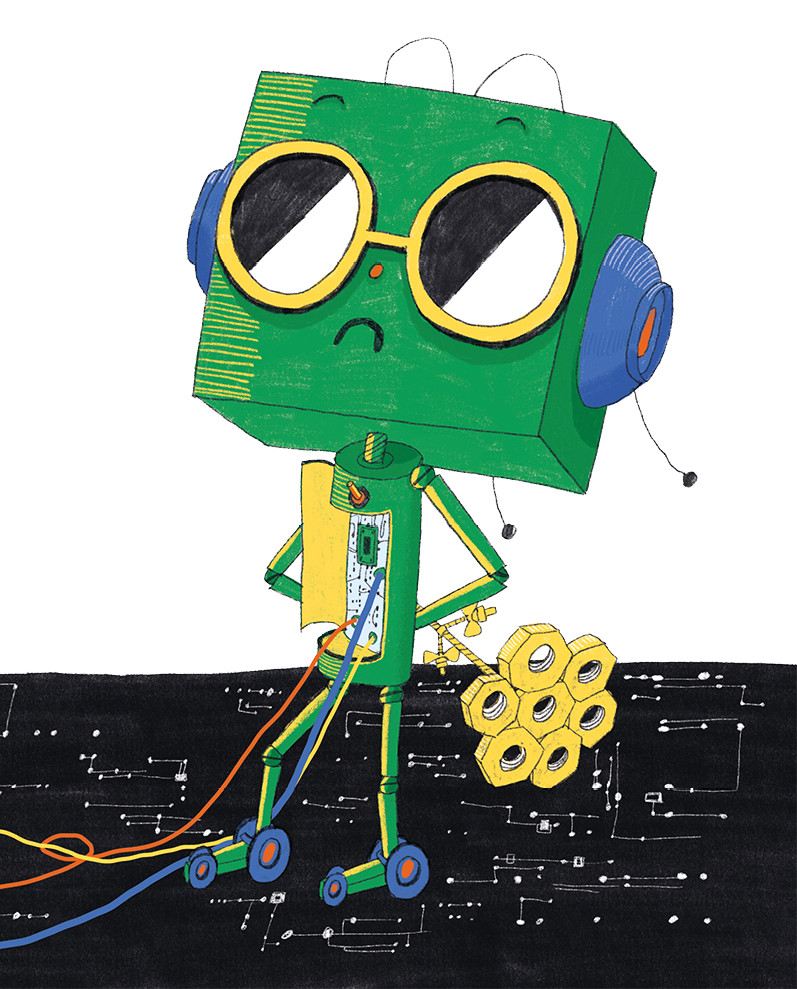 Докторобот попросил Роботёнка покрутить шестерёнками, подвигать антенками, помигать лампочками и поговорить на разных языках. «Языковая плата работает. С роботоорганизмом тоже всё в порядке. Здоровье у тебя железное, – заключил докторобот. – Теперь проверим твою микросхему». Он подключил проводки к нагрудному ящичку Роботёнка, в котором находилась маленькая зелёная пластинка, хранящая все его знания. Докторобот задумался и начал медленно перечислять: «Расстройство линейных уравнений… алогизмоз… синдром Поэткинсона… программная недостаточность… Всё ясно, ваш роботёнок подхватил вирус homo sapiens. Он поражает микросхему робота и образ его мышления и заставляет совершать нелогические и эмоциональные поступки. Я смог устранить большинство неисправностей, но этот вирус очень сложно победить. Прописываю вам смазочное масло для микросхемы с запахом серебра. Смазывать два раза в день все шестерёнки и каждый день повторять главные законы роботов: «Логика – это высшая форма разума. Всё, что нелогично, опасно».