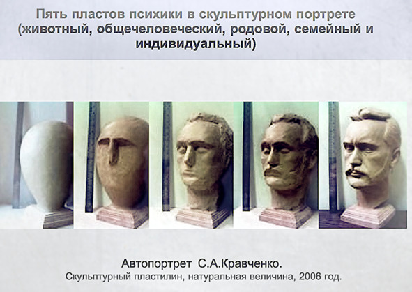 Плавное развитие скульптурного портрета от примитивной формы до полного сходства с натурой позволяет через ассоциации выделить пласт психики и, сосредоточившись на нем, раскрыть те душевные особенности и силы личности, которые до этого могли быть скрыты, забыты, ущемлены или полностью заблокированы.