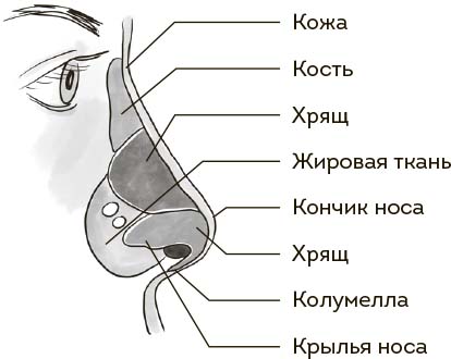 Наружный нос состоит из кости и хряща, покрытых кожей. Можете потрогать свой: там, где твердо, начинается костная часть. Два мягких кусочка кожи по бокам – это крылья носа. Между ноздрями начинается носовая перегородка, передний отдел которой носит красивое имя «колумелла» (нежная подвижная перемычка из хрящевой ткани и кожи).