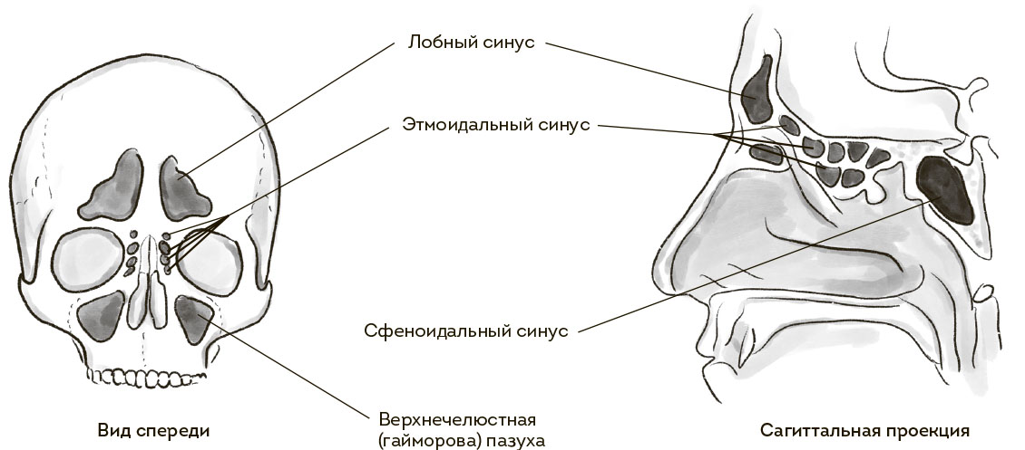 Теперь пазухи. Хитрые пещерки в полости черепа, сообщающиеся с носовой полостью. Помимо общеизвестных гайморовых (верхнечелюстных) и эпизодически упоминаемых лобных (фронтальных), есть еще полумифические клиновидные (сфеноидальные) и решетчатый лабиринт (этмоидальный синус). И поверьте, демонизируемый гайморит – наименьшее из зол, что может приключиться с этими пещерками.