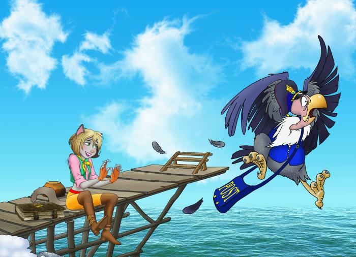 Незваным гостем оказался немолодой уже кондор: через левое крыло переброшен ремень синей сумки – та явно мешала ему взлететь. Птица молча остановилась напротив Джен. Сбросив ремень, освободилась от груза, размяла плечи и взъерошила помятые перья. Щелкнув парой пряжек, откинула крышку сумки: