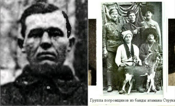 «Довольно значимой фигурой Гражданской войны на территории Украины со стороны „повстанцев“, был атаман Илья Струк. Он любил рассказывать, что служил матросом на императорской яхте „Штандарт“. Якобы трижды был ранен, после госпиталя переведен в пехоту, где дослужился до капитана и получил Георгиевские кресты всех 4-х ступеней. Только вот „Штандарт“ в боях не участвовал, Илья Струк в списке награжденных Георгиевским крестом не значится. Илья Струк на период Февральской революции был довольно молод – ему исполнился лишь 21 год. Воевать Струк любил и умел, но вот мыслить конструктивно, увы, не научился. Трехтысячный отряд, сформированный Струком из малороссийских крестьян, орудовал на Северной Киевщине. Струк пытался заигрывать с большевиками, видя в них серьезную силу и рассчитывая сделать военную карьеру в случае победы Красной армии. Однако, именно то самое отсутствие внутренней дисциплины и способности к конструктивному мышлению, через две недели после присоединения отрядов Струка к Красной армии в феврале 1919 года, заставило его повернуть оружие против недавних союзников. В частности, Струк не скрывал свой антисемитизм и организовал кровавые еврейские погромы в разных местах в близи Киева». Источник: https://clck.ru/35doFD