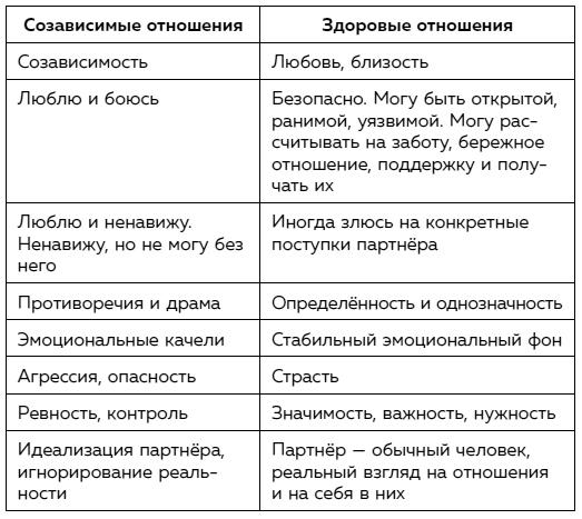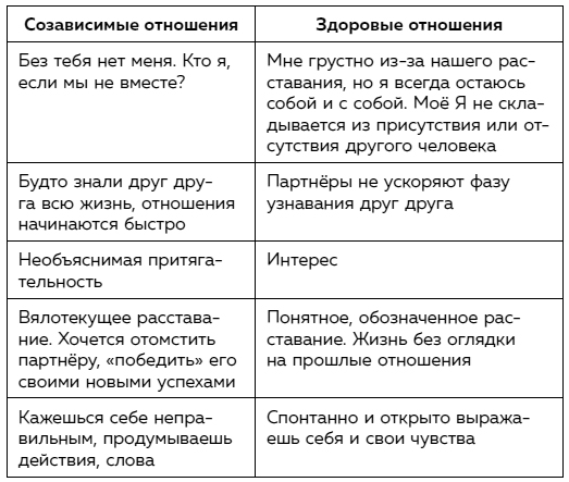 Другие причины этой боли мы разберем в следующих главах. Ниже вы найдете список признаков созависимых и здоровых отношений. Яркую черту последних очень точно сформулировала певица Софья Таюрская[11]: