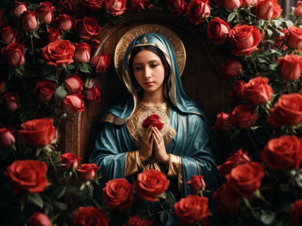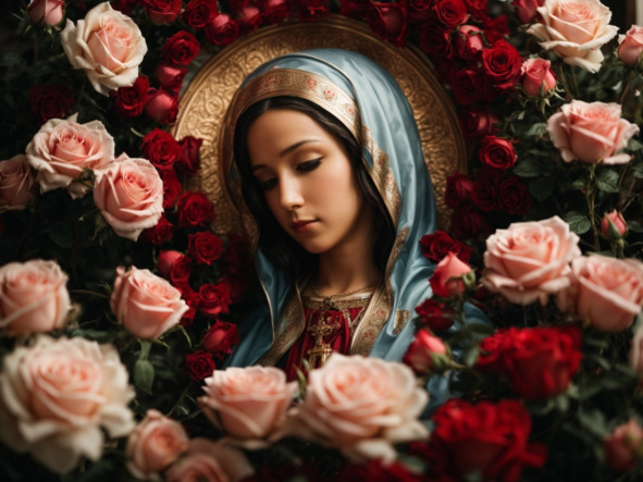 In art and religious symbolism, the rose is often depicted as an attribute of Mary, adorning images and statues of her. It serves as a reminder of her purity, beauty, and maternal love, reflecting her special place as the Mother of God.