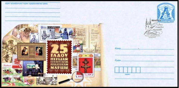 25 гадоў першай Беларускай паштовай марцы. Канвэрт пошты Беларусі, выдадзены ў 2017 (Памылка. 99 гадоў) А