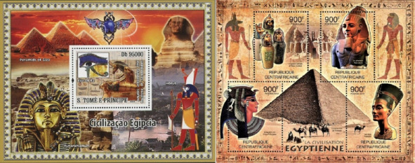 Эгіпецкая цывілізацыя. Блёк пошты Сан-Тамэ і Прынсіпі, выдадзены ў 2008 і блёк пошты Цэнтральна-Афрыканскай Рэспублікі, выдадзены ў 2012