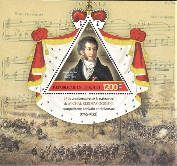 У картушы надпіс на францускай мове: 250-годзьдзе з дня нараджэньня Міхала Клеафаса Агінскага, кампазытара, пісьменьніка і дыплямата (1765—1833). На полі блёку ўверсе слова POLONEZ, ніжэй – ноты і фрагмэнт Рацлавіцкай панарамы (Бітва пад Рацлавіцамі 4 красавіка 1794).