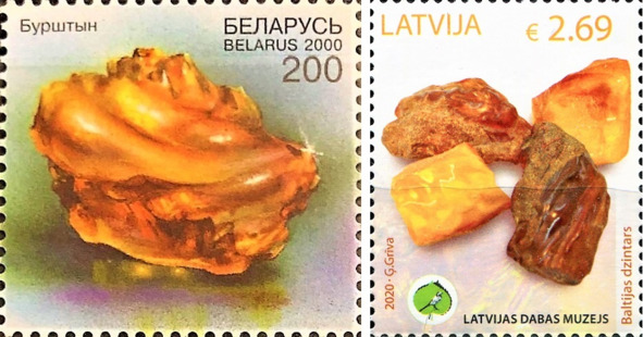 Бурштын. Марка пошты Беларусі, выдадзеная ў 2009. Марка Латвіі, выдадзеная ў 2020