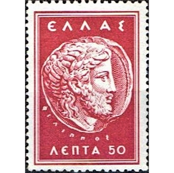 Тетрадрахм Піліпа Другога з галавой Зеўса. 359 – 336 да Р. Х. Марка пошты Грэцыі, выдадзеная ў 1956