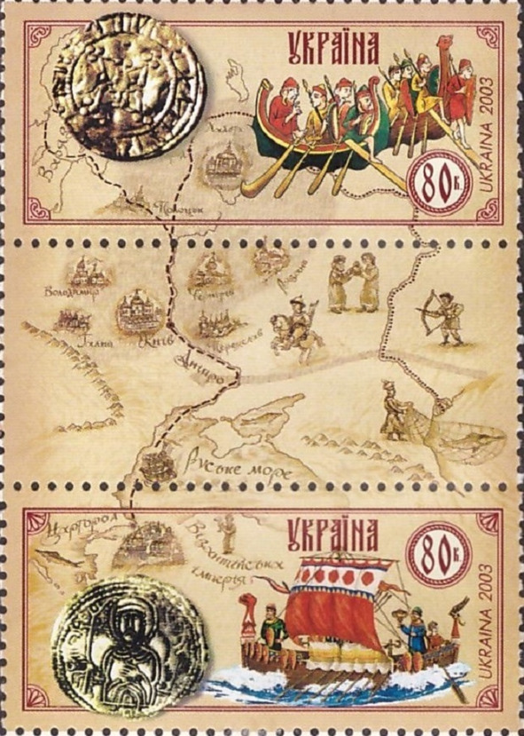 Старажытныя гандлёвыя шляхі. Счэпка «Шлях з варагаў у грэкі». Высадка скандынаўскіх маракоў. Славяне на баявой ладзьдзі. Сумесны выпуск Украіны і Эстоніі ў 2003