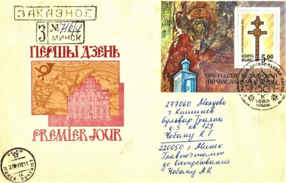 Канвэрт першага дня з блёкам ў гонар 1000-годзьдзя Полацкай эпархіі, выдадзены ў 1992