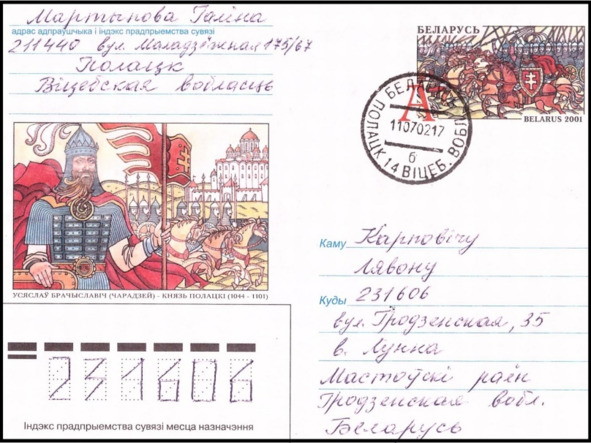 Усяслаў Чарадзей. Марачны канвэрт, выдадзены поштай Беларусі ў 2001