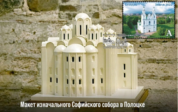 Полацкая Сафія. Макет першапачатковага выгляду. Картмаксімум пошты Беларусі, выдадзены ў 2022. Паштовая марка з сучасным выглядам Полацкай Сафі