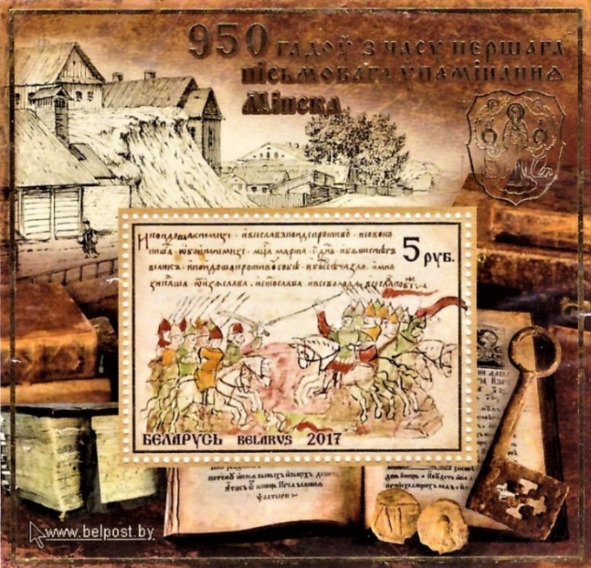950 гадоў з часу першага пісьмовага ўпамінаньня Менску. Блёк пошты Беларусі, выдадзены ў 2017