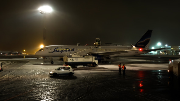 Нам опять повезло. Не прошло и пяти минут после закрытия дверей, как к нам подъехали два «Элефанта» и принялись поливать наш зелёный лайнер, защищая самолёт от возможного наземного обледенения.