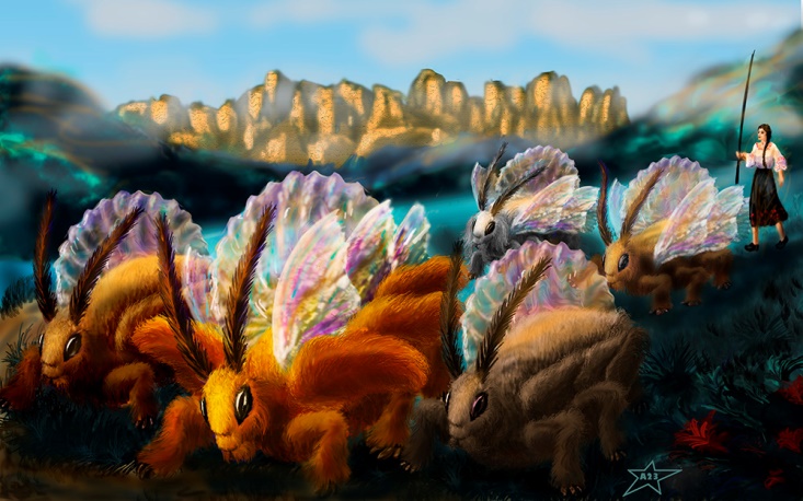 Нарика распахнула дверь хлева, и во двор, толкаясь высокими гребнями на спине, выбежали огромные мохнатые жуки ростом немногим ниже самой Нарики, а длиной раза в два больше. Великан, Серый, Забияка, Забава и Малышка – все пятеро на месте. А как куколки? Она заглянула в угол хлева, где в мягких гнездах из златоцветовых листьев лежали мохнатые куколки семикрылов длиной чуть больше локтя. Личинки уже шевелились в них, но вылупливаться пока не собирались. Вот ведь как устроено в жизни, личинки небольшие, сейчас там внутри у них ни крыльев, ни шерсти нет, а вылупятся из них молодые жучки и за два года вон в каких вырастают!
