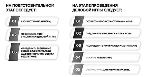 Самой большой популярностью в сфере образования пользуются в настоящее время деловые (ролевые) игры. Деловые игры были придуманы впервые в Советском Союзе в 1932 г. Обращение к формату деловых игр было связано с проблемами быстрой индустриализации. В Ленинградском инженерно-экономическом институте под руководством Марии Бирштейн были организованы первые организационно-производственные испытания, которые позднее были названы деловыми играми «Пуск цеха». К сожалению, впоследствии деловые игры были надолго запрещены в Советском Союзе. Своего расцвета они достигли уже в США. Сначала игры использовались для выполнения военных задач Пентагона, а потом – и для развития бизнеса и образования[6].