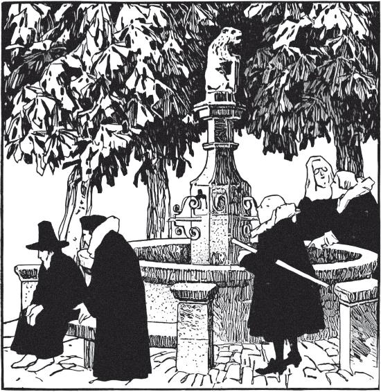 Наконец, прибыл он к городу, в котором фонтан иссяк. И там тоже он передал привратнику то, что слышал от черта: «Сидит жаба в фонтане под камнем, ее должны вы сыскать и убить, тогда и фонтан ваш опять будет вином бить».
