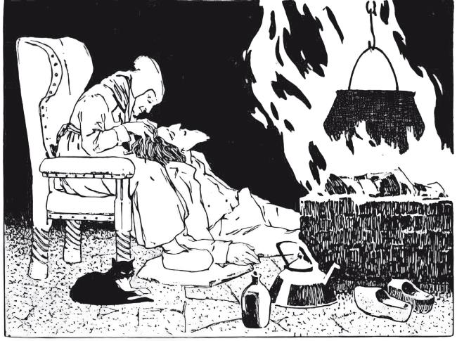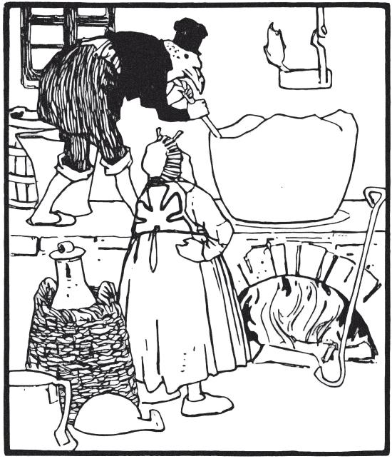 В самой преисподней стены были черны от сажи и копоти; а самого-то черта дома не было, и только его мать сидела на своем просторном кресле. «Чего тебе?» – спросила она у юноши и на вид показалась ему совсем не злой. «Да вот надо бы мне раздобыться тремя золотыми волосками с головы черта, – отвечал юноша, – а не то придется мне с женой расстаться». – «Ну, ты уж очень многого захотел, – сказала она, – ведь если черт вернется да найдет тебя здесь, так тебе несдобровать; но мне тебя жаль, и я посмотрю, не могу ли я тебе чем помочь».