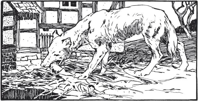 Корову убили, а желудок ее, в котором сидел Мальчик-с-пальчик, выбросили на навозную кучу. Малютка с великим трудом стал из желудка выбираться и расчищать в нем место; но едва только он захотел из желудка выглянуть на свет Божий, пришла новая беда: набежал голодный волк и разом проглотил весь желудок.