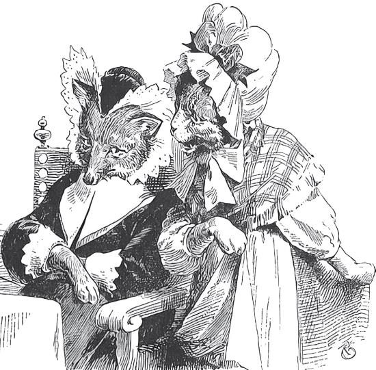 Когда старый лис умер, волк явился сватать лисоньку; постучал в двери, и кошка, которая была у лисоньки в служанках, отворила ему. Волк поклонился и сказал: