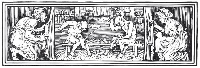 Ровно в полночь явились два маленьких красивеньких человечка; совсем маленькие, сели они за рабочий стол башмачника, взяли все накроенные работы и начали своими крошечными пальчиками так проворно и быстро тыкать шилом, тачать да постукивать молоточками, что башмачник в изумлении не мог от них и глаз отвести. И работали они до тех пор, пока всей работы не переделали и не выставили на стол готовую обувь; тогда они живо собрались и исчезли мигом.