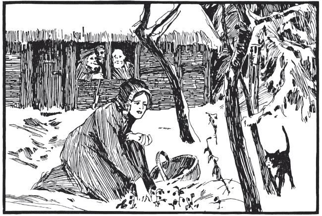 Падчерица послушалась мачехи, надела бумажное платье и вышла из дома с корзиночкой. Везде кругом только и видно было, что снег, и из-под него не торчало ни одной зеленой былиночки.