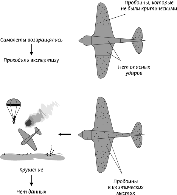 Военные инженеры рекомендовали укреплять наиболее поврежденные части вернувшихся самолетов. Однако Абрахам Вальд математически доказал, что если самолет смог вернуться на базу, то попадания в пострадавшие части не критические. Он рекомендовал авиаконструкторам бронировать те места, где у вернувшихся из боя машин не было повреждений (рис. 3).