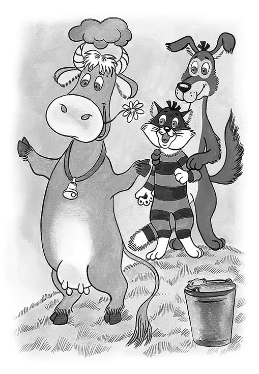 Но дядя Фёдор всё коту объяснил. И занавесочки показал объеденные. А пёс корову за хвост держит – мало ли что!