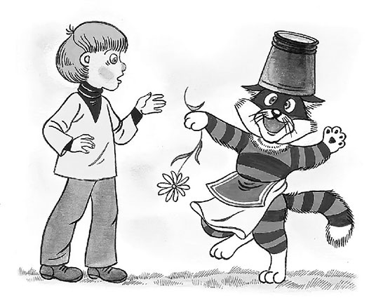 Митя стоял, стоял, потом как затарахтит – и на кота! Кот ведро бросил и скорее на дерево! А Митя стал ведром в футбол играть. Играл, играл, пока в лепёшку не превратил. Ай да модель инженера Тяпкина!