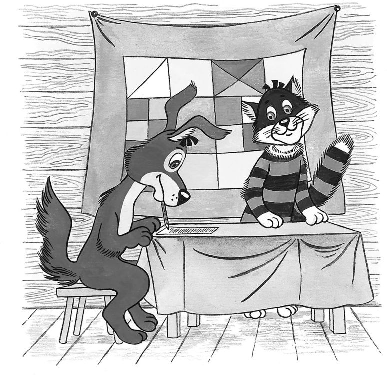Но тут дядя Фёдор увидел, что деревенские ребята змея в поле запускают. И дядя Фёдор к ним побежал. А коту велел письмо дописывать за него. Кот взял карандаш и начал писать: