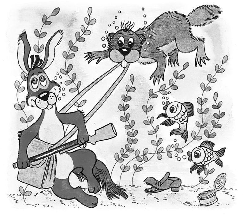 Вылез из сумки – и по следу. Ружьё за спиной, нос в землю. Добежал до узенькой речки, видит: заяц уже на том берегу скачет. Пёс ружьё в зубы и поплыл – не бросать же зайца! А ружьё тяжёлое – вот-вот утопит Шарика. Смотрит Шарик, а он уже на дне.