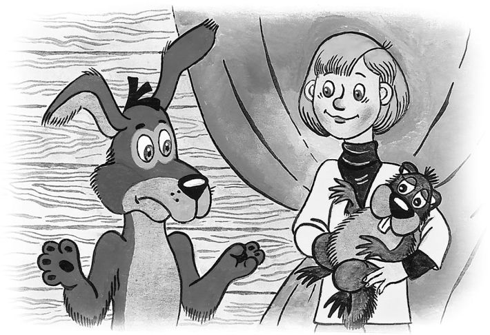Заяц увидел его – и бежать. Шарик – за ним. Но споткнулся обо что-то и в сумке запутался. В которой надо добычу носить. Сидит он в сумке и думает: «Ничего себе охота начинается! Что же это, я теперь сам себя домой понесу?! Выходит, я же и охотник, я же и трофей? То-то смеху будет…»
