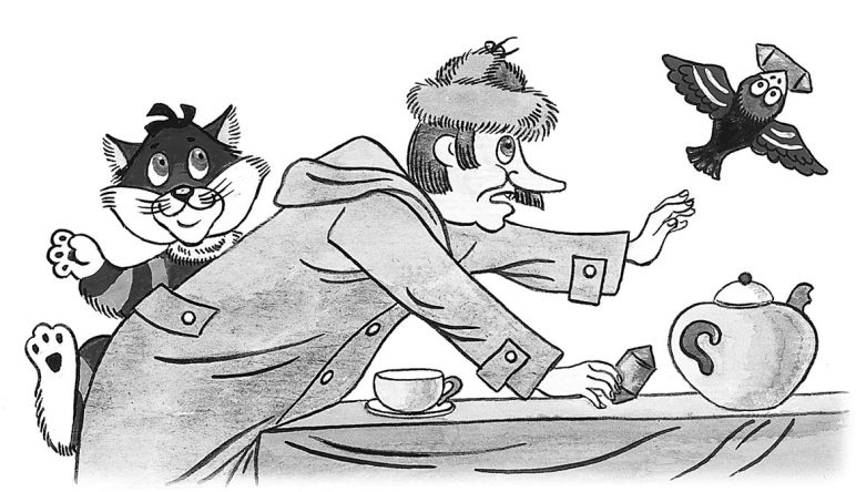 Наконец они весь чай выпили и пироги съели. А Печкин всё равно сидит. Он думает, что ему ещё что-нибудь дадут. Шарик ему намекает: