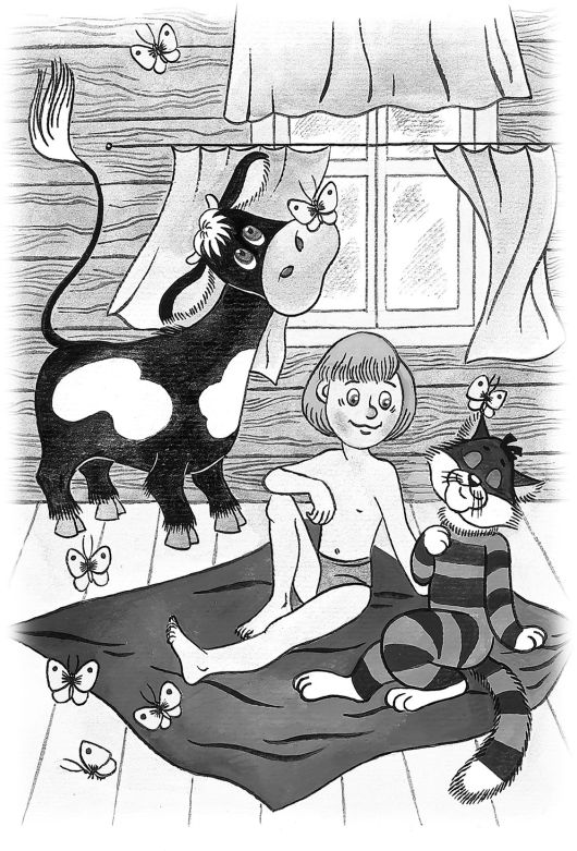 Он постелил одеяло на полу, лёг на него в трусиках и спину солнышку подставил. И кот на одеяло лёг, греться стал. И всё в доме ожило. И цветы к солнцу потянулись, и бабочки откуда-то выбрались. И телёнок Гаврюша стал скакать, как на лужайке.