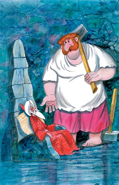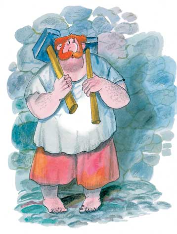 Тотчас же в пещеру, топая босыми ногами, протирая заспанные зелёные глазищи, ввалился здоровый верзила в малиновых трусах и с кувалдой.
