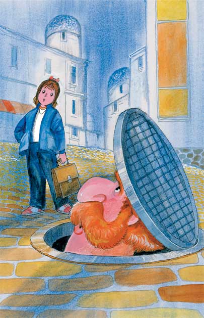 Вдруг канализационный люк перед ней открылся, и из него высунулась здоровая курчавая голова размером с большой котёл для плова.