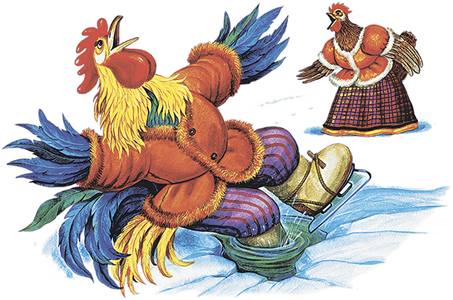 Не послушался петушок, напился холодной воды, и тут же стала бить его лихорадка; насилу домой курочка довела. Побежала курочка за доктором, прописал доктор Пете горького лекарства, и долго пролежал петушок в постели. Выздоровел он к зиме и видит, что речка ледком покрылась; захотелось Пете на коньках покататься, а курочка и говорит ему:
