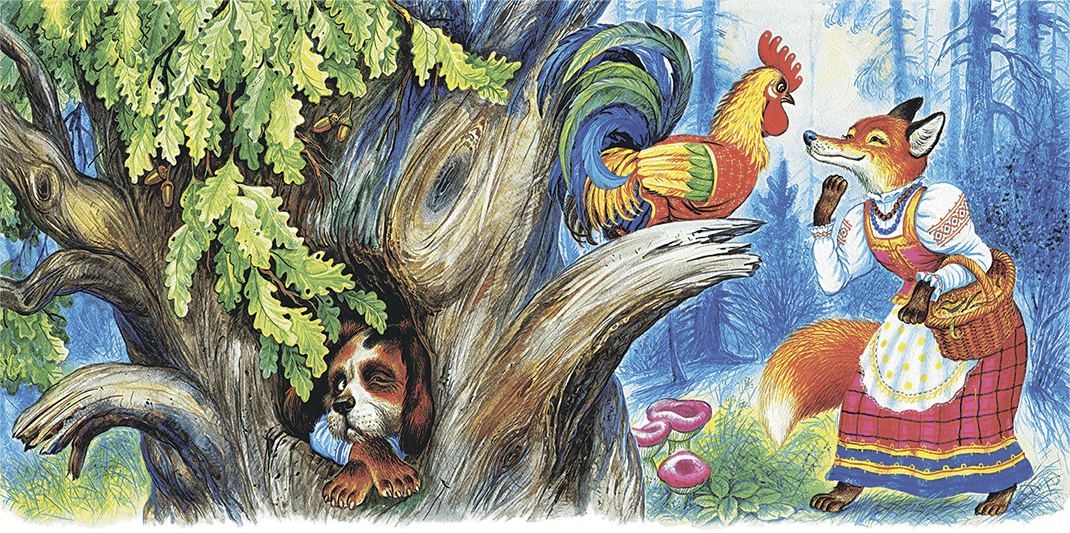 Услыхала петуха лиса; захотелось ей петушьим мясом полакомиться. Вот она подошла к дереву и стала петуха расхваливать: